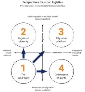 Een interessante gedachte is het organiseren van lokale bezorgcorporaties waarbij de overheid de corporaties helpt met data delen (via kleine platforms) en stadslogistieke hubs. Dit kan bijvoorbeeld gebeuren door binnen de stad een regelgevingskader voor stadslogistiek te creëren (met gereguleerde diversiteit), door een integrale aanpak van het logistieke verkeer in te voeren (met een stadsbreed platform). Onlangs presenteerden BVL en Roland Berger een onderzoek naar de rol van lokale overheden hierbij.