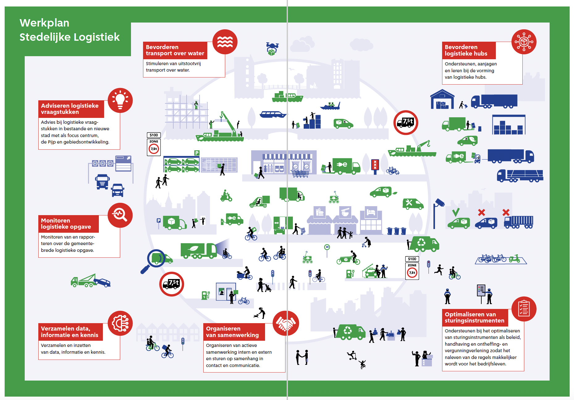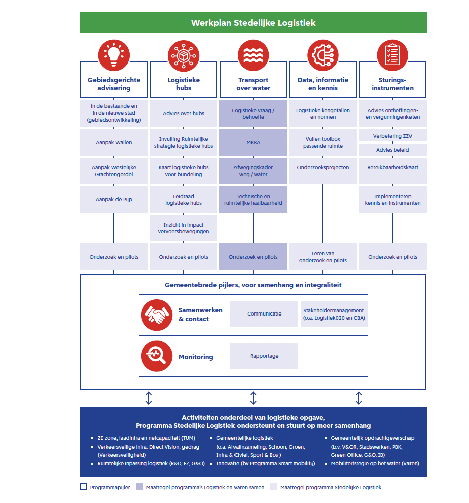 De activiteiten en maatregelen voor het programmateam Stedelijke Logistiek zijn onderverdeeld in zeven pijlers: