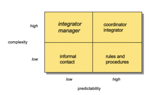 Achieving an ‘optimum’ solution for the entire organization requires greater effort. In a situation with a high logistics complexity and a low logistics predictability, coordination cannot only be realized via the existing hierarchical structure and formal consultation. The logistics department not only has a coordinating role in the preparation of the plan, but also especially in the logistics control of the decision-making concerning deviations. The logistics department must be able to influence the decision-making or even have the powers to take decisions.