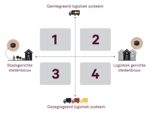 - Scenario 4: gesegregeerd logistiek systeem binnen een logistiek gerichte stedenbouw. Logistiek domineert de buitenruimte; onder andere prioriteitsstroken voor bevoorrading en bezorging aan huis zorgen voor een maximale beschikbaarheid en snelle levering via bijvoorbeeld dark stores.