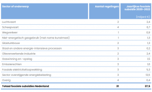 Vervuilers krijgen volgens milieuclubs tot wel 37,5 miljard euro aan fossiele subsidies. Met fossiele subsidies worden belastingmaatregelen bedoeld die indirect een financieel voordeel opleveren voor fossiel energieverbruik. Hiervan gaat bijna 1 miljard naar het wegvervoer (inclusief personenmobiliteit), bijna 7 miljard naar de scheepvaart en ruim 2 miljard naar de luchtvaart.